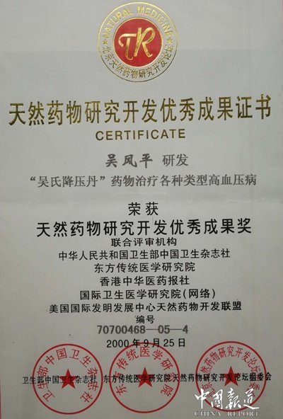 吳風平,男,醫(yī)學博士、主任醫(yī)師、執(zhí)業(yè)醫(yī)師、高級針灸師、高級中藥技師。九代中醫(yī)世家,六歲學醫(yī),十三歲臨床,師承國家中醫(yī)前輩呂炳奎、朱良春、周仲瑛、關(guān)幼波?,F(xiàn)任北京至德圣道中醫(yī)藥研究院院長;國際中醫(yī)藥防治癌癥聯(lián)盟主席;中國民族醫(yī)藥學會疑難病分會指導專家;中國針灸學會全國委員;全國中醫(yī)難治病專家委員會專家委員;中國藥文化研究會專家委員;華佗針灸研究會顧問;陜西至德圣道醫(yī)藥科技有限公司董事長;陜西吳文化發(fā)展有限公司董事長;安康傳統(tǒng)醫(yī)學研究所所長;安康至德堂中醫(yī)館館長;吳氏至德堂中醫(yī)第九代傳承人;國家非物質(zhì)文化遺產(chǎn)保護項目《吳氏中風偏癱療法》持有人與傳承人,擁有多項國家發(fā)明專利,多項成果被授予“天然藥物研究開發(fā)優(yōu)秀成果獎”,其中治療癌癥的《吳氏六位一體療法》被授予“第五屆全球華人醫(yī)學大會2002年度華佗杯全球華人醫(yī)藥學科技成果金獎”;被中華中醫(yī)藥學會授予“2009年度全國基層優(yōu)秀中醫(yī)”稱號等榮譽。