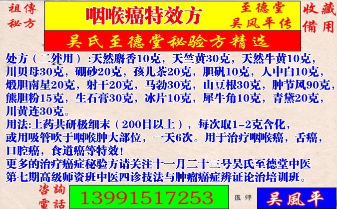 用法:上藥共研極細(xì)末(200目以上),每次取1-2克含化,或用吸管吹于咽喉腫大部位,一天6次。用于治療咽喉癌,舌癌,口腔癌,食道癌等特效!