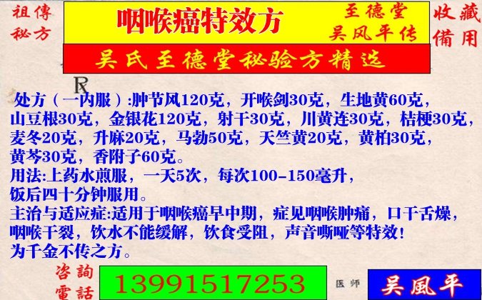 主治與適應(yīng)癥:適用于咽喉癌早中期,癥見咽喉腫痛,口干舌燥,咽喉干裂,飲水不能緩解,飲食受阻,聲音嘶啞等特效!為千金不傳之方。