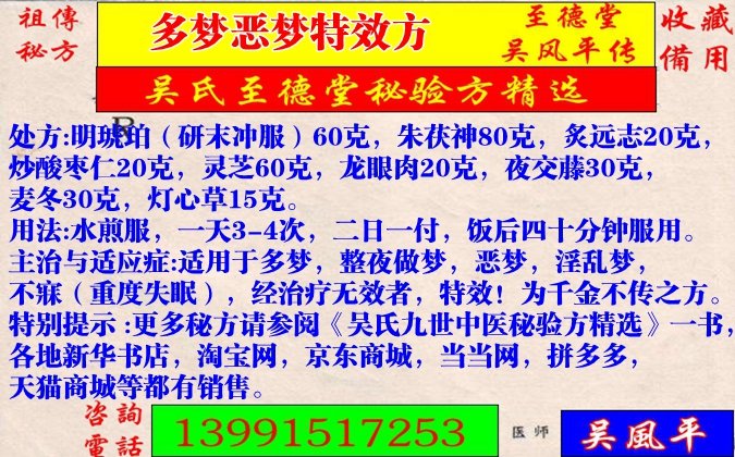 主治與適應(yīng)癥:適用于多夢,整夜做夢,惡夢,淫亂夢,不寐(重度失眠),經(jīng)治療無效者,特效!為千金不傳之方。