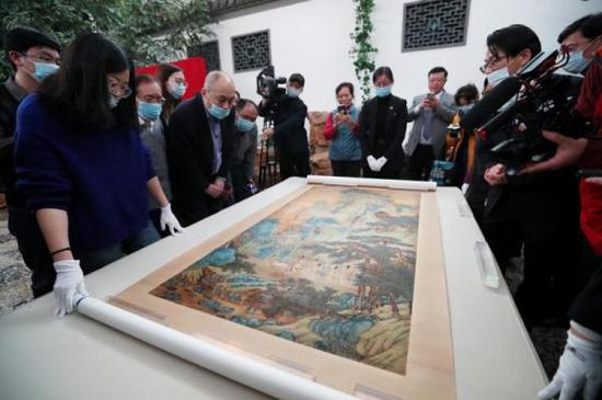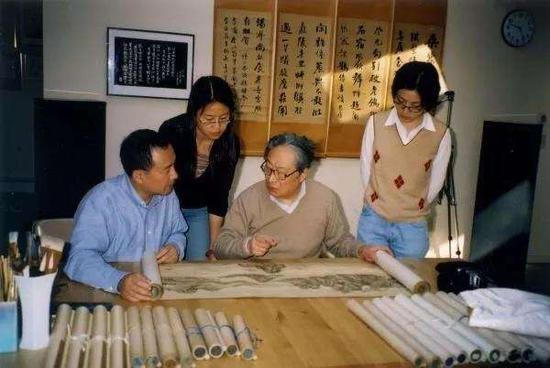 藝術(shù)史系學(xué)者白謙慎與學(xué)生在翁萬戈家里觀摩《長江萬里圖》