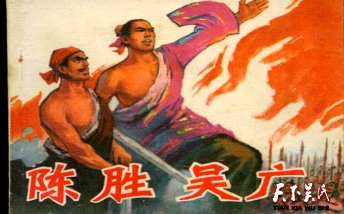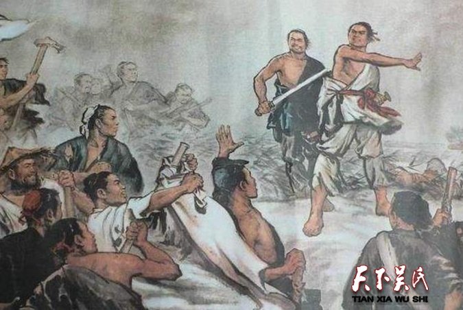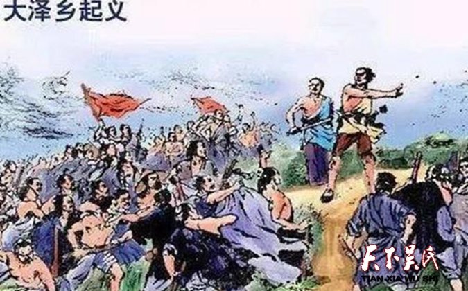 公元前209年,陽城,即今河南登封東南的地方官派了兩個軍官,押著九百名民夫送到漁陽,即今北京市密云西南去防守。軍官從這批壯丁當中挑了兩個個兒大、辦事能干的人當屯長,叫他們管理其他的人。這兩個人一個叫陳勝,陽城人;一個叫吳廣,陽夏人,是個貧苦農民。七月,恰遇天下大雨,道路不通,他們估計已經耽誤了到達漁陽規(guī)定的期限。過了規(guī)定的期限,按照當時的法津規(guī)定是都要被殺頭的。