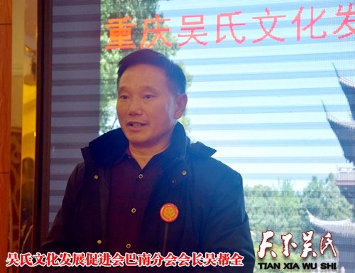 吳氏文化發(fā)展促進(jìn)會巴南分會會長吳幫全發(fā)表就職演講,表示一定盡職盡責(zé)帶好頭、辦好事,為巴南吳氏辦實(shí)事。