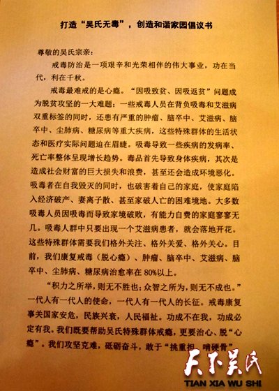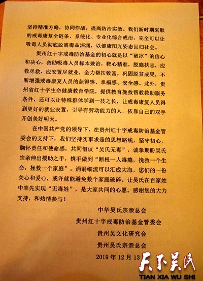 由中華吳氏宗親總會、貴州省紅十字會戒毒防治基金委員會、貴州省吳氏宗親總會會長、貴州省吳文化研究中心聯(lián)合發(fā)起的打造“吳氏無毒”創(chuàng)造和諧家園倡議書得到參會代表的大力支持,此外,書法墨寶贈,豐富多彩的文藝節(jié)目,抽獎活動為聯(lián)誼會助興。
