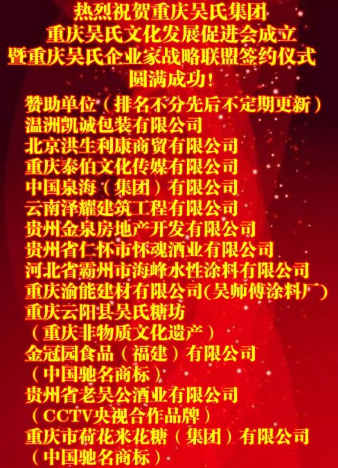 重慶吳氏文化發(fā)展促進(jìn)會(huì)的成立,讓吳氏企業(yè)負(fù)責(zé)人深刻意識(shí)到弘揚(yáng)至德精神,傳承吳文化,家風(fēng)傳承樹典范的重要性,因而得到以下吳氏企業(yè)的鼎力支持!