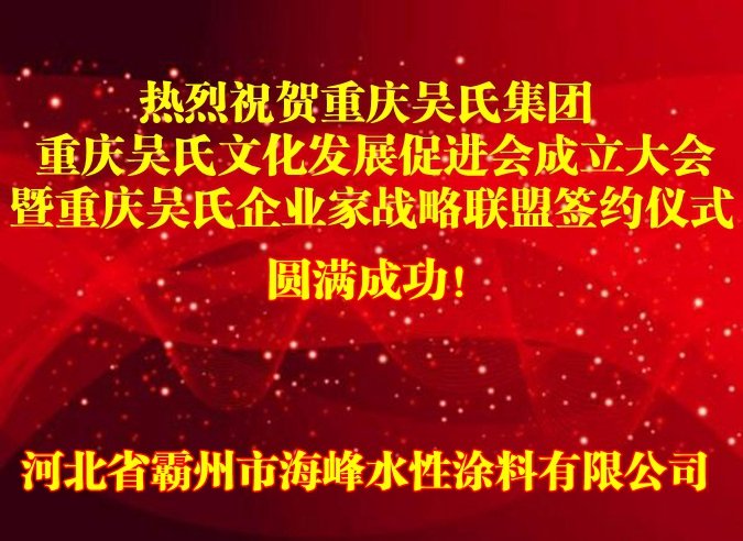 河北省霸州市海峰水性涂料有限公司為重慶吳氏集團(tuán)、重慶吳氏文化發(fā)展促進(jìn)會(huì)成立大會(huì)暨重慶吳氏企業(yè)家戰(zhàn)略聯(lián)盟簽約儀式贊助人民幣5000元。