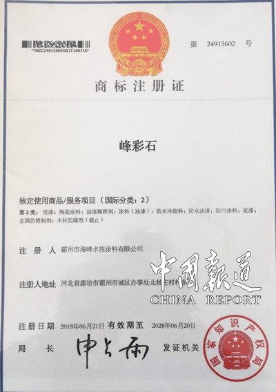 河北省霸州市海峰水性涂料有限公司峰彩石漆集團公司始創(chuàng)于1999年。公司已通過ISO9001、ISO14000、CNAS、UL等認證, 產(chǎn)品皆獲得CCC、FDA認證, 為客戶直接提供國際認可的權(quán)威性認證報告。公司本著以人為本,專注水漆的經(jīng)營理念,為人民服務(wù)的宗旨,主要從事水性涂料的研發(fā)與生產(chǎn),以及施工。產(chǎn)品包括水包水、水包砂、真石漆、質(zhì)感漆、外墻乳膠漆等系列。產(chǎn)品遍布全國,在國內(nèi)有7大生產(chǎn)基地。分別分布在,河北霸州、新疆喀什、陜西西安、湖北武漢、云南昆明、遼寧開原、湖南長沙。