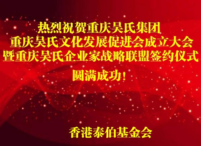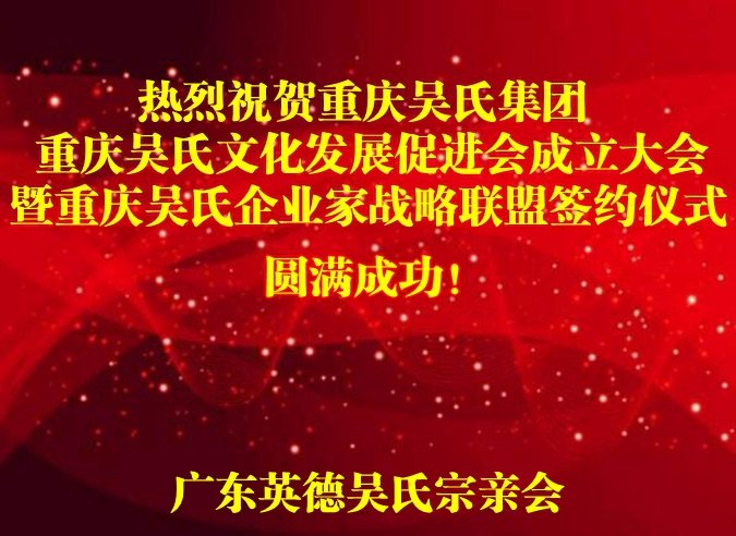 恭祝盛會(huì)開成重慶吳氏大家庭精誠(chéng)團(tuán)結(jié)大會(huì)!通力合作的大會(huì)!圓滿成功的大會(huì)!