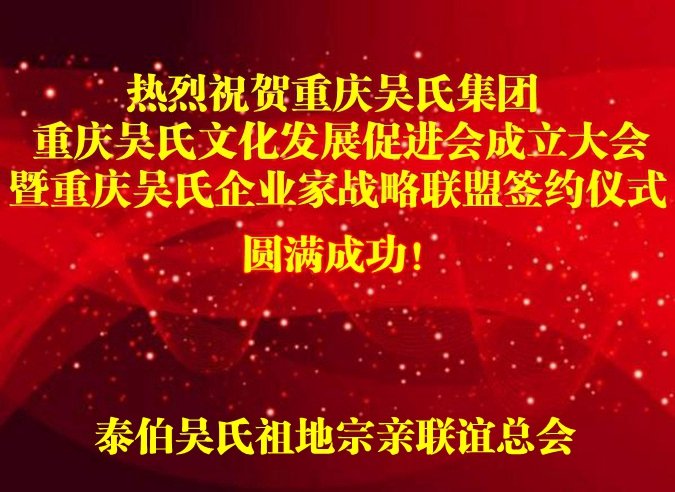 今天,重慶吳氏集團(tuán)、重慶吳氏文促會(huì)成立大會(huì)暨重慶吳氏企業(yè)家戰(zhàn)略聯(lián)盟簽約儀式,將團(tuán)結(jié)聚集重慶吳氏家族宗親,對(duì)傳承、弘揚(yáng)、研究吳氏文化、加強(qiáng)海內(nèi)外吳氏經(jīng)濟(jì)文化的聯(lián)系和交流將起到極大的推動(dòng)作用!泰伯吳氏祖地宗親聯(lián)誼總會(huì)再次表示熱烈的祝賀!