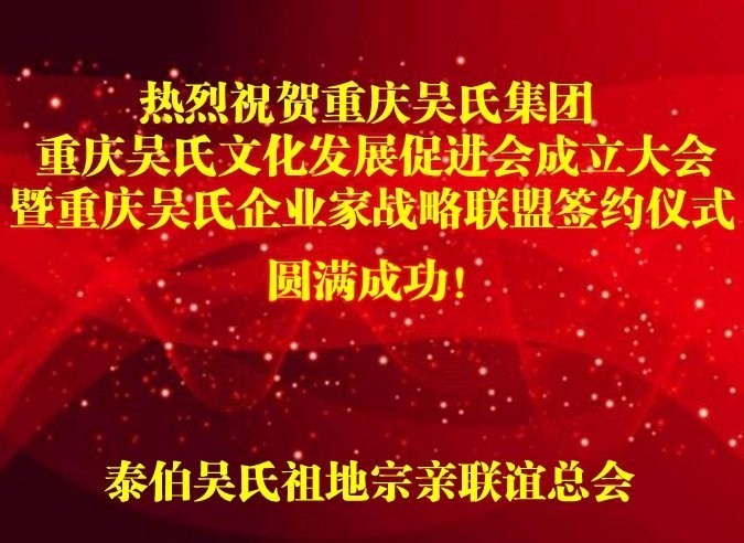 今天,重慶吳氏集團、重慶吳氏文促會成立大會暨重慶吳氏企業(yè)家戰(zhàn)略聯盟簽約儀式,將團結聚集重慶吳氏家族宗親,對傳承、弘揚、研究吳氏文化、加強海內外吳氏經濟文化的聯系和交流將起到極大的推動作用!泰伯吳氏祖地宗親聯誼總會再次表示熱烈的祝賀!