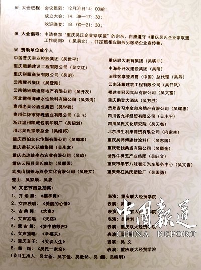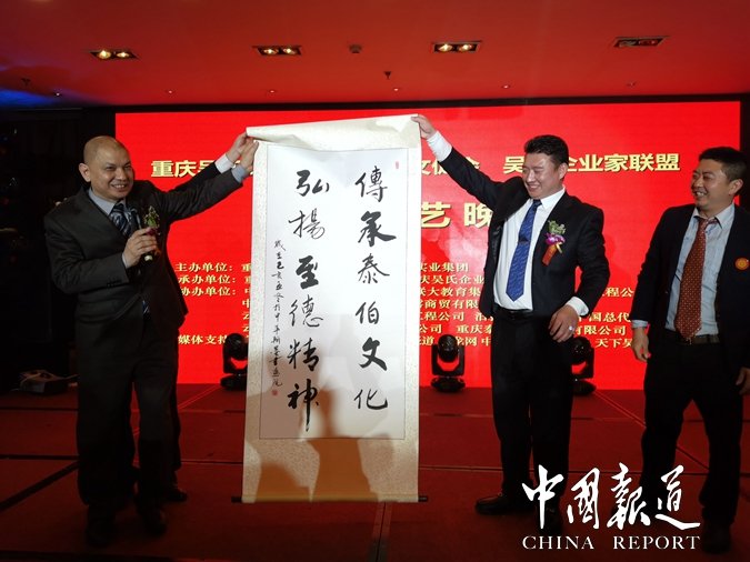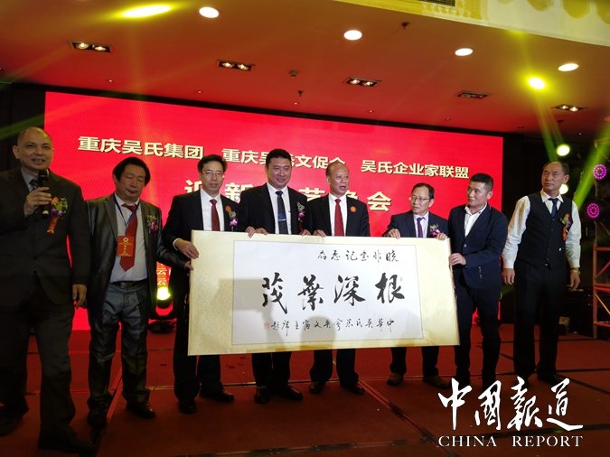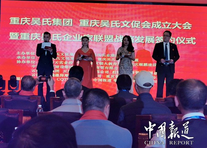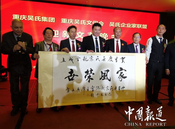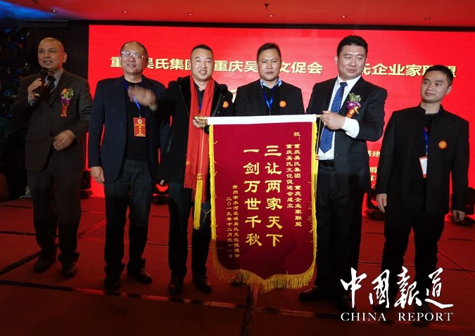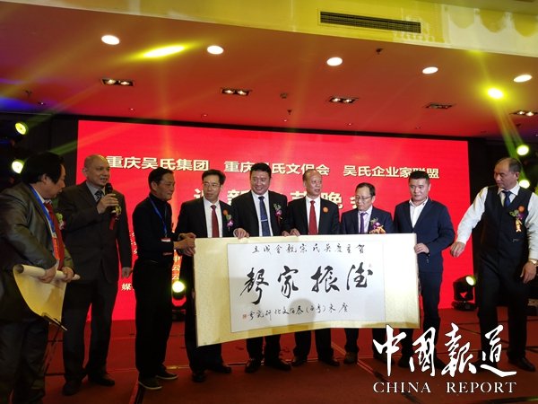 為成立大會傾情贊助吳氏企業(yè)及宗親會代表應(yīng)邀出席,他們分別是云南耀興集團(tuán)董事長吳登剛,云南澤耀建筑工程公司董事長吳開鳳,貴州金泉房地產(chǎn)開發(fā)公司董事長吳躍忠,中海外建設(shè)(集團(tuán))有限公司總經(jīng)理吳明,重慶嶄露商貿(mào)有限公司董事長吳明,德宏瑞通房地產(chǎn)開發(fā)公司董事長吳開友,河北省霸州市海峰水性涂料公司吳弟海董事長,重慶鵬登大酒店董事長吳方勝,重慶梁平乾錢典當(dāng)行董事長吳順奎,中華吳氏宗親總會四川分會會長吳維幫,中國普天(集團(tuán))實業(yè)控股公司董事長吳世平,重慶聯(lián)大教育(集團(tuán))有限公司董事長吳曉非,重慶泰伯文化傳媒有限公司董事長吳蜀豐,溫洲凱誠包裝有限公司董事長吳紹劃,北京洪生利康商貿(mào)有限公司董事長向家生,四川省九祥經(jīng)貿(mào)有限公司董事長吳小平,貴州省荷花酒業(yè)有限公司董事長吳光才。貴州省仁懷市懷魂酒業(yè)有限公司董事長吳海軍,武夷山福茶馬燕茶文化有限公司董事長吳旺文,重慶市杰瓊蛙生態(tài)農(nóng)業(yè)有限公司董事長吳瓊,重慶泊雅客酒業(yè)法國摩登男爵(中國)總代理董事長吳丹,重慶渝能建材有限公司(吳師傅涂料廠)董事長吳志國,重慶云陽縣吳氏糖坊(重慶非物質(zhì)文化遺產(chǎn))董事長吳厚國,金冠園食品(福建)有限公司(中國馳名商標(biāo))董事長吳文富,貴州省吳氏宗親總會會長、貴州省吳文化研究會會長、貴州省老吳公酒業(yè)有限公司(CCTV央視合作品牌)董事長吳學(xué)強(qiáng),重慶市荷花米花糖(集團(tuán))有限公司(中國馳名商標(biāo))董事長吳永富,重慶奉節(jié)縣八妹集團(tuán)智匯汽車服務(wù)中心董事長吳文香及來自重慶本地38區(qū)縣代表近400余名宗親代表出席本次盛典。此外,江西吳氏文史研究會、江西吳氏宗親總會副會長吳啟文宗長贈送《華夏吳氏情》40冊。
