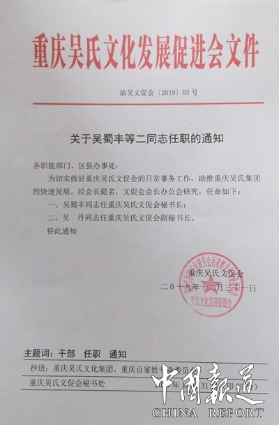 同時任命吳順奎梁平分會副會長,永川分會執(zhí)行會長吳志國,奉節(jié)分會常務(wù)副會長吳文香,吳克林任南岸分會常務(wù)副會長,吳立明任巴南分會會長,吳進(jìn)建任渝北分會會長,吳建軍任璧山分會會長,吳方勝任九龍坡分會會長,吳必勇任秀山分會會長,吳書民任豐都分會會長。