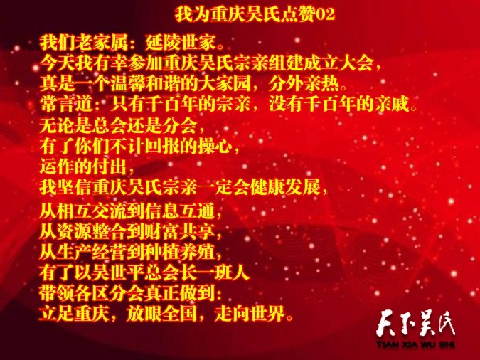 無論是總會(huì)還是分會(huì),有了你們不計(jì)回報(bào)的操心,運(yùn)作的付出,我堅(jiān)信重慶吳氏宗親一定會(huì)健康發(fā)展,