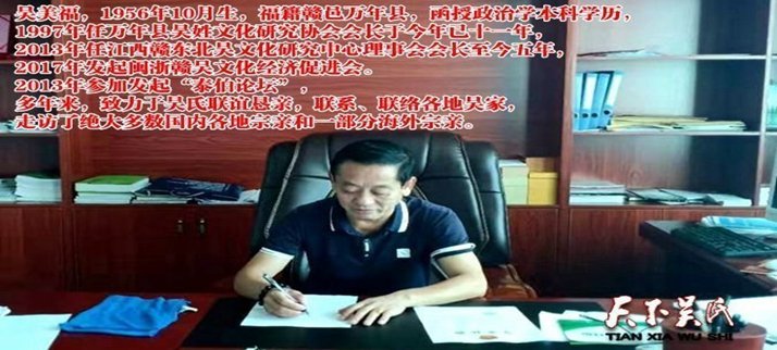 【作者簡(jiǎn)介】吳美福,男,1956年10月生,福籍贛邑萬(wàn)年縣,現(xiàn)定居縣城。函授政治學(xué)本科學(xué)歷,1997年任萬(wàn)年縣吳姓文化研究協(xié)會(huì)會(huì)長(zhǎng)于今年已十一年,2013年任江西贛東北吳文化研究中心理事會(huì)會(huì)長(zhǎng)至今五年,2017年發(fā)起閩浙贛吳文化經(jīng)濟(jì)促進(jìn)會(huì)。2013年參加發(fā)起“泰伯論壇”,多年來(lái),致力于吳氏聯(lián)誼懇親,聯(lián)系、聯(lián)絡(luò)各地吳家,走訪了絕大多數(shù)國(guó)內(nèi)各地宗親和一部分海外宗親。