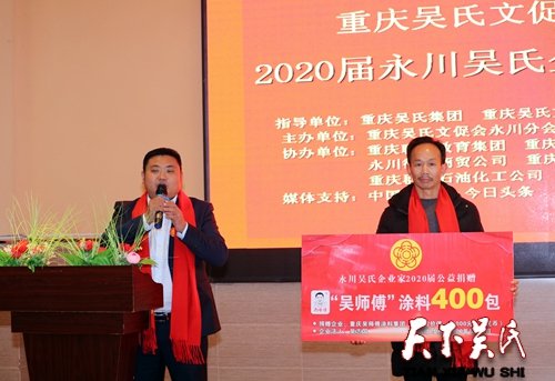 重慶吳氏文促會永川分會執(zhí)行會長吳志國致歡迎詞,重慶吳氏文促會永川分會會長吳曉非講話;重慶吳氏文促會永川分會副會長兼秘書長吳清倫宗親宣讀《永川吳氏企業(yè)家公益倡議書》;舉行永川吳氏企業(yè)家聯(lián)盟2020屆善行公益活動:永川吳氏企業(yè)家——重慶吳師傅涂料集團(tuán)董事長吳志國向困難的永川吳氏宗親捐贈涂料;永川分會副秘書長吳平志代永川的困難吳氏宗親接受捐贈。