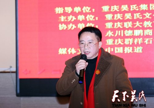 重慶聯(lián)大教育集團(tuán)董事長吳曉非,重慶吳師傅涂料集團(tuán)董事長吳志國,重慶浩洲物資公司董事長吳清倫,重慶吳平志養(yǎng)蜂農(nóng)場董事長吳平志,永川德鵬商貿(mào)公司董事長吳德鵬,重慶群祥石油化工公司總經(jīng)理吳敏,重慶逸志電器廠董事長吳修煉及銅梁分會的宗親代表吳尚洪,顧問吳成江先后發(fā)言。