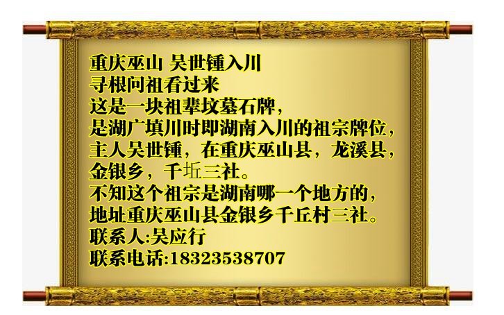 這是一塊祖輩墳?zāi)故?,是湖廣填川時(shí)即湖南入川的祖宗牌位,主人名川吳世鍾,在重慶巫山縣龍溪縣金銀鄉(xiāng)千坵三社。