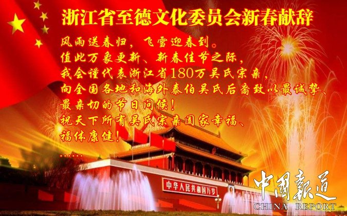 風(fēng)雨送春歸,飛雪迎春到。值此萬(wàn)象更新、新春佳節(jié)之際,我會(huì)謹(jǐn)代表浙江省180萬(wàn)吳氏宗親,向全國(guó)各地和海外泰伯吳氏后裔致以最誠(chéng)摯、最親切的節(jié)日問(wèn)候!祝天下所有吳氏宗親闔家幸福、福體康健!