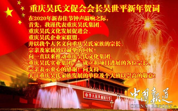 展望2020年,我們將積極推進與中國重慶——各部門的密切合作,最大限度地滿足家族內(nèi)部宗親的需求,為重慶吳氏家族企業(yè)在中國的發(fā)展作岀更大的貢獻。我堅信2020年就是練就重慶吳氏集團健碩的血肉之軀的一年,也是我們共同見證吳氏家族奇跡的一年。為實現(xiàn)重慶吳氏三百萬工程(300萬人)努力奮斗!新春佳節(jié)來臨之際,世平祝愿重慶吳氏家族的明天更加美好,祝福大家在新的一年里,財源滾滾達三江、好運綿綿連四海!
