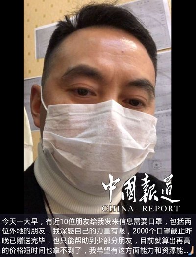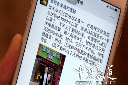 眾志成城抗擊疫情,疫情無(wú)情人間有愛(ài)。1月24日,永川的一位熱心市民花了4000塊錢(qián)從河南一家企業(yè)購(gòu)買(mǎi)了2000個(gè)口罩免費(fèi)向市民發(fā)放。吳春是一名普通市民,從事香臘制品銷(xiāo)售,幾天前了解到因受新型冠狀病毒感染的肺炎疫情影響,很多永川市民購(gòu)買(mǎi)口罩成了難題。他剛好得知一企業(yè)大約有2000多個(gè)庫(kù)存口罩,臘月二十九上午就購(gòu)買(mǎi)了1000個(gè),中午在朋友圈發(fā)布信息,讓需要的市民到店里領(lǐng)取,當(dāng)天發(fā)出去600個(gè)。當(dāng)天晚上,他又想辦法購(gòu)買(mǎi)了1000個(gè),不僅在店里向市民發(fā)放,還來(lái)到居民小區(qū)集中發(fā)放。