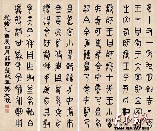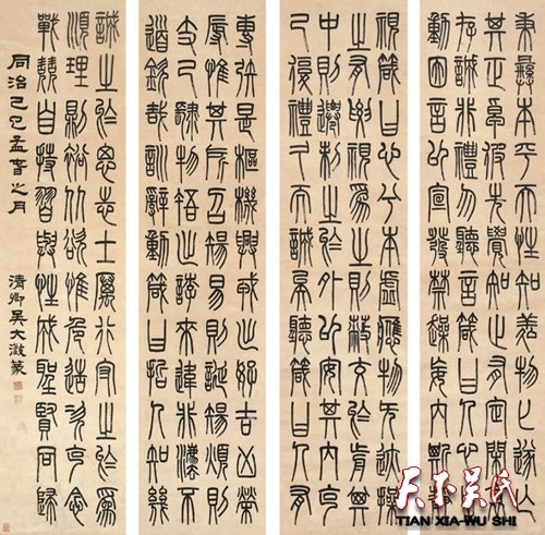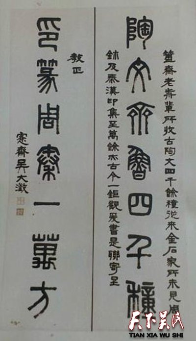 橫批:一臥滄江。吳大澂精于鑒別和古文字考釋,亦工篆刻和書畫。吳大澂書法以篆書最為著名。他的篆書很有特色,將小篆古籀文結(jié)合,功力甚深,即平時書翰也常用工整精絕的篆字為之,規(guī)矩整齊,別有情致。早年師從陳碩父學(xué)篆書,中年以后又參照古籀文,書法益進。他開始學(xué)秦代小篆刻石,書法酷似李陽冰。后受楊沂孫的啟示,將小篆與金文相結(jié)合,并用這種方法書寫《論語》、《孝經(jīng)》以及信札。他的篆書大小參差、淵雅樸茂,在當時是一種創(chuàng)造。他對金石文字有精深的研究,開拓了對先秦文字的廣闊的視野,使他的篆書從中汲取了不少的營養(yǎng)。吳大澂寫篆書,喜用隸書書款。他的隸書橫平豎直,亦取法漢碑。行書學(xué)曾國藩,又頗有黃庭堅的趣味。吳大澂又以詩詞及散文著稱。著有《愙齋詩文集》、《說文古籀補》、《字說》、《愙齋集古錄》、《古玉圖考》、《權(quán)衡度量實驗考》、《恒軒所見所藏吉金錄》、《吉林勘界記》、《十六金符齋印存》等十余種。