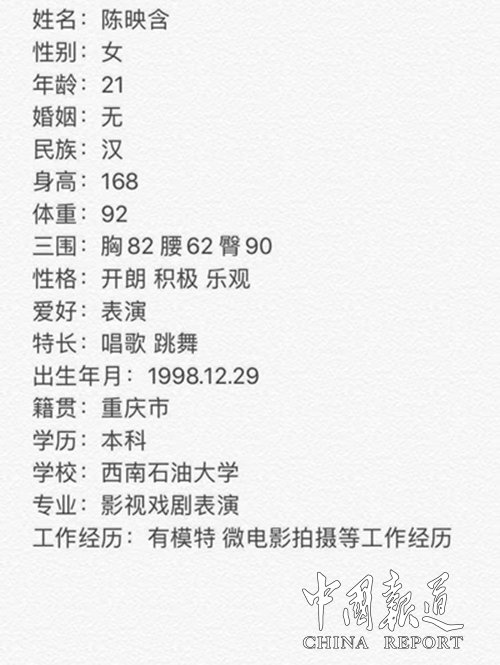 中國(guó)報(bào)道訊(吳蜀豐報(bào)道)陳映含,出生在中國(guó)神曲之鄉(xiāng)三峽庫(kù)區(qū)--豐都鬼城,就讀于西南石油大學(xué)藝術(shù)學(xué)院影視戲劇表演系。業(yè)余時(shí)嘗試接拍過多部微電影,上鏡賞心悅目,入戲角色絕配,頗受觀眾喜愛。