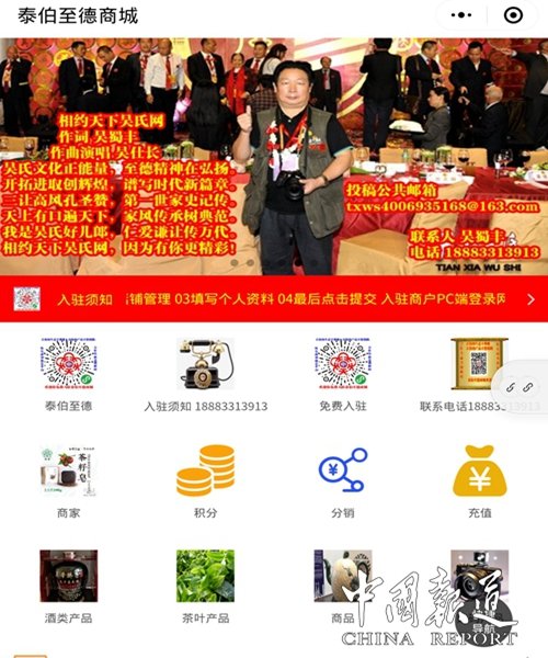 重慶泰伯文化傳媒有限公司(原名豐一佳文化傳播)自2013年成立以至今,公司旗下的天下吳氏網(2018年10月1日全球上線)、至德傳媒網及公眾號以傳承吳文化為己任,弘揚至德精神為宗旨及傳播吳氏正能量,己發(fā)表有關吳氏新聞資訊達6700篇文章受到廣泛好評。在天下吳氏網3周年之前,再投巨資開設小程序《泰伯至德商城》為天下太伯公后裔的送來一份厚重的福利。特別歡迎吳、周、蔡、翁、曹、辛、柯、洪、江、方、龔、汪等十二姓氏宗親優(yōu)先入駐本商城。