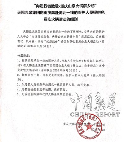 【特別提示】重慶奔赴湖北一線的醫(yī)護人員,持本人有效證件(相關(guān)部門證明),均可在天賜溫泉集團旗下的天賜山泉火鍋(壁山店、白市驛店)享受免費吃火鍋活動(活動截至2020年9月30日).如和親友一起,可享受七折優(yōu)惠,醫(yī)護人員本人免單(按人均消費)。如用餐人員都是奔赴湖北一線的醫(yī)護人員,均可免單。用餐前請查看就餐地圖,提前預(yù)訂。此活動最終解釋權(quán)歸天賜溫泉集團所有。