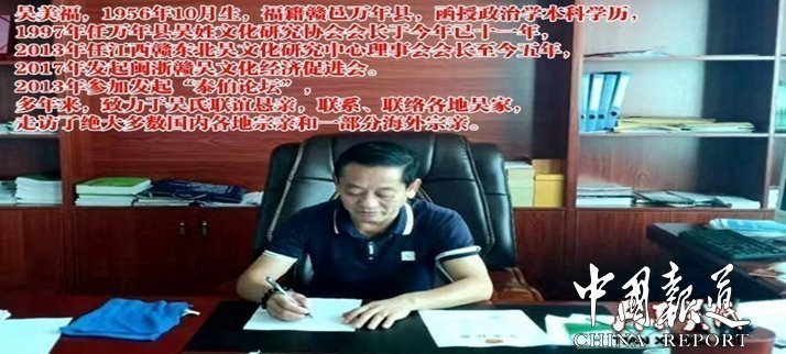 【作者簡介】吳美福,男,1956年10月生,福籍贛邑萬年縣,現(xiàn)定居縣城。函授政治學本科學歷,1997年任萬年縣吳姓文化研究協(xié)會會長于今年已十一年,2013年任江西贛東北吳文化研究中心理事會會長至今五年,2017年發(fā)起閩浙贛吳文化經(jīng)濟促進會。2013年參加發(fā)起“泰伯論壇”,多年來,致力于吳氏聯(lián)誼懇親,聯(lián)系、聯(lián)絡各地吳家,走訪了絕大多數(shù)國內(nèi)各地宗親和一部分海外宗親。