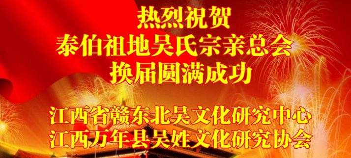 欣聞泰伯祖地吳氏宗親總會換屆大會順利召開,我代表江西省贛東北吳文化研究中心,江西萬年縣吳姓文化研究協(xié)會表示熱烈的衷心的祝賀: