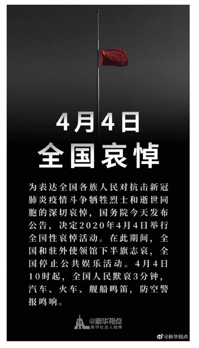 周五(4月3日)中國國務(wù)院辦公廳在一則通知中指出,為表達(dá)全國各族人民對抗擊新冠肺炎疫情斗爭犧牲烈士和逝世同胞的深切哀悼,國務(wù)院決定,2020年4月4日舉行全國性哀悼活動。在此期間,全國和駐外使領(lǐng)館下半旗志哀,全國停止公共娛樂活動。4月4日10時起,全國人民默哀3分鐘,汽車、火車、艦船鳴笛,防空警報鳴響。