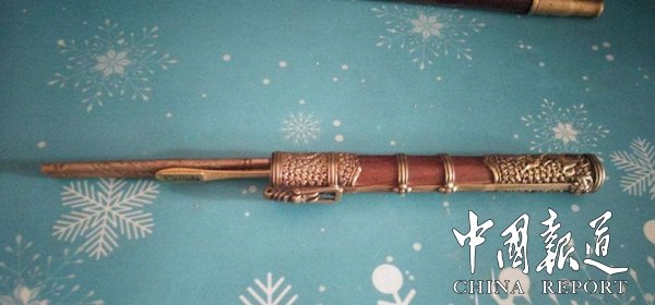 據(jù)1980年為7期《文物》載,四川珙縣洛表公社的懸棺內(nèi),清理出一支明代紅漆竹箸,箸長28公分,首方足圓,四楞上部刻有“江山口高曰月口長五子口阿旦休”草書體十四字,其中三字腐蝕難以辨認,由此可以說明,有了方箸也有了箸上詩詞。另在河南寧陵花岡明代的一艘木船中發(fā)現(xiàn)一支木箸,長達3l公分:無獨有偶,也是方首圓足,還有北京定陵為明代神宗朱翊鈞的陵墓,在1956年發(fā)掘的地宮中,除了出土有寶石金釵、金壺、金爵、金冠、金匙、箸瓶架等,瓶架上還插有烏木鑲金箸。筆者曾慕名參觀定陵,欣賞了陳列的明神宗陪葬品兩雙烏木鑲金箸,此御箸也是首方足圓,不過四楞箸頂端鑲有方金帽。經(jīng)專家研究,方首圓足款式為明代箸的流行樣式。