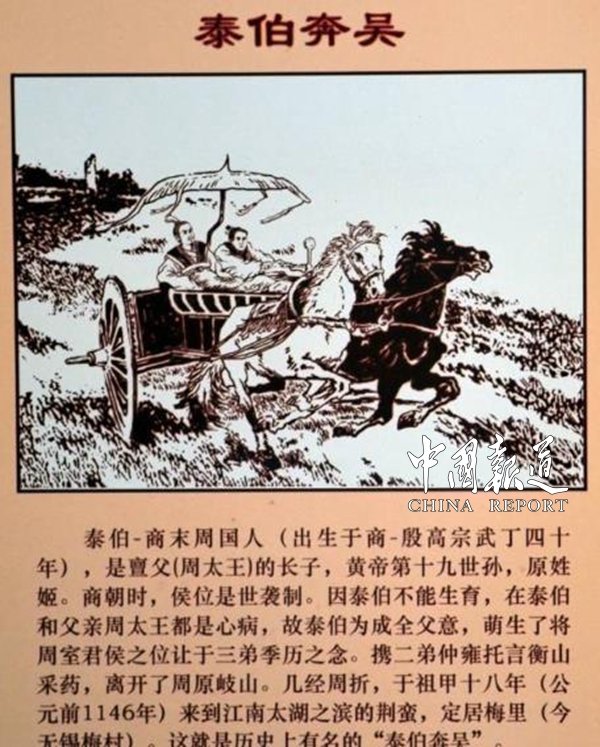 岐有商廟,攸念伯仲;古公三子,共懷圣德;太伯仲雍,三讓季歷,初隱吳山,又奔荊蠻,翻山渡水,孝服成縷,岐人居喪,今著《斬衰》。泰伯奔吳、廣施仁德;斷發(fā)文身,入鄉(xiāng)隨俗,既興農(nóng)耕,亦利舟楫;吳人擁戴,推為國(guó)君;周土文明,遠(yuǎn)播南國(guó),偉業(yè)勝跡,常熟無(wú)錫!說(shuō)的是周太王長(zhǎng)次子泰伯仲雍奔吳的故事。