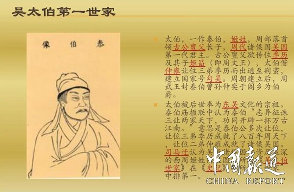 吳太伯,名泰伯,吳國(guó)第一代君主,東吳文化的祖宗。商代人,姬姓,周人后裔,是陜西岐山岐周姬周族首任首領(lǐng)古公亶父的長(zhǎng)子、黃帝26世孫、后稷十四世孫。一生成就周天下和吳國(guó),開(kāi)發(fā)江南。尊稱(chēng)“江南人文始祖”、“讓王”、“至德賢圣”。