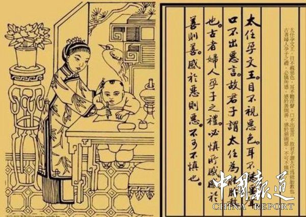 《列女傳·母儀傳》:太任文王之母,摯任氏之仲也,王季娶以為妃,太任之性,端一誠莊,惟德之行。及其妊文王。目不視惡色,耳不聽淫聲,口不出敖言。生文王而明圣,太妊教之,以一而識(shí)日,卒為周宗。君子謂太任為能胎教。