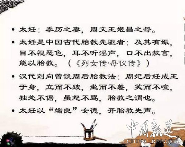 太妊在主持后宮期間,立身端莊,因?yàn)樗穆氏却狗?,宮庭上下肅穆祥和。太妊有了身孕,懷上姬昌(即周文王)后,她眼睛不看邪事物和景象,耳不聽淫逸無禮的聲音,口不講傲慢自大的言語,不歪著身子睡覺,閑時(shí)就正心靜座,讓樂師朗誦詩歌來陶冶情操?!读遗畟?middot;母儀傳·周室三母》中記載: “大妊(太妊)者,文王之母,摯任氏中女也。王季娶為妃。大妊之性,端以成莊,惟德之行。及其有娠,目不視惡色,耳不聽淫聲,口不出敖言,能以胎教。溲于豕牢,而生文王。文王生而明圣,太妊教之,以一而識(shí)百,卒為周宗。君子謂大妊為能胎教。古者婦人妊子,寢不側(cè),坐不邊,立不蹕,不食邪味,割不正之食,席不正不坐,目不視于邪色,耳不聽于淫聲。夜則令瞽誦詩,道正事。如此,則生子形容端莊,才德必過人矣。故妊子之時(shí),必慎所感。感于善則善,感于惡則惡。人生而肖萬物者,皆其母感于物,故形音肖子。文王母可謂知肖化矣。”這就是說,太妊在懷孕之時(shí),以保持仁愛祥和的心態(tài),讓胎兒受到良好的教育。