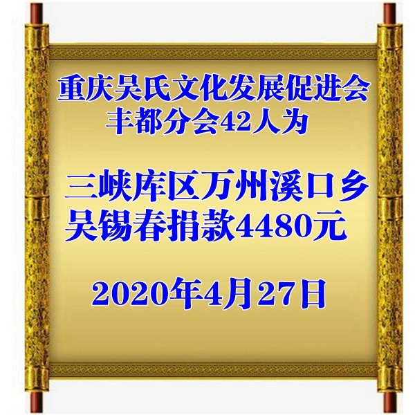4月27日,重慶吳氏文促會豐都分會積極響應(yīng)重慶吳氏文化發(fā)展促進(jìn)會的倡議,組織42人為三峽庫區(qū)萬州溪口鄉(xiāng)吳錫春捐款4480元。這是2020年第三次參與公益愛心行動。豐都分會會長吳書民表示,豐都吳姓雖然只有6637人,但人心齊,很團(tuán)結(jié)。尊老愛幼,百善孝為先,傳承吳氏家風(fēng)是我們一如繼往的美德。我們將繼續(xù)為更多的人送關(guān)懷送溫暖。