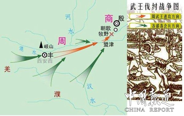 文王遷都于灃(今陜西長(zhǎng)安),祖父王季和大哥伯邑考被無(wú)道商王殺害所迸發(fā)出來(lái)的改天拔殷的決心,在父親文王死后,由武王所繼承。通過(guò)四代人社會(huì)基礎(chǔ)和經(jīng)濟(jì)力量的積蓄,距今三千多年的帝辛三十一年、公元前1046年2月,周部落首領(lǐng)姬發(fā)在文王去世后后的第四年,聯(lián)合了八百個(gè)部落起兵伐紂,開(kāi)始了推翻殷商王朝的、夏商周最大的一次戰(zhàn)役—牧野(今河南淇縣)之戰(zhàn)。武王滅商是從豐京開(kāi)始的,滅商的軍隊(duì)是從岐山的畢地鳳凰山出發(fā)的。