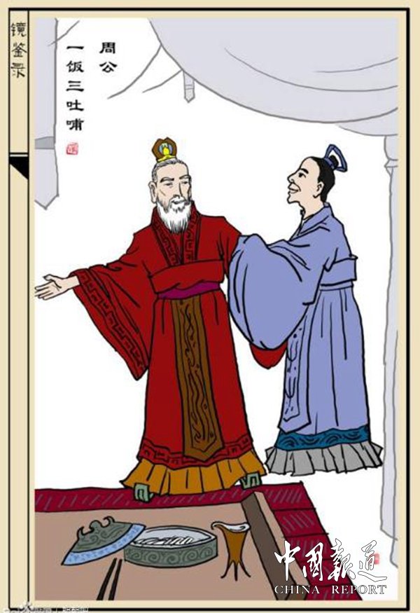 為了國家興旺,他明德慎罰,勤理國事,周公非常重視人才的接納和任用。凡是有賢士前來拜訪,他總是在第一時(shí)間去接見。一次在吃飯的時(shí)候,他聽說有人來拜訪,好幾次將吃在觜里飯吐出來,立即去接見來人。還有在沐浴的時(shí)候,有才能的人先后來拜訪和急事要辦,他好幾次停止沐浴,終止洗頭,握著頭發(fā)前去接待來人,生怕怠慢來人,錯(cuò)失人才,耽擱事務(wù),即使這樣,周公還擔(dān)心失去天下賢人的輔助,這就是歷史上有名的“一沐三握發(fā),一飯三吐哺”典故。三國時(shí)期著名政治家、文學(xué)家曹操在《短歌行》中對周公非常仰慕和贊美,慷慨道:“周公吐哺,天下歸心”。周公“一沐三握發(fā),一飯三吐哺”,禮賢下士,重用人才,為周王朝蠃得了許多治國理政的賢才,使周王朝政權(quán)穩(wěn)固,繁榮昌盛。
