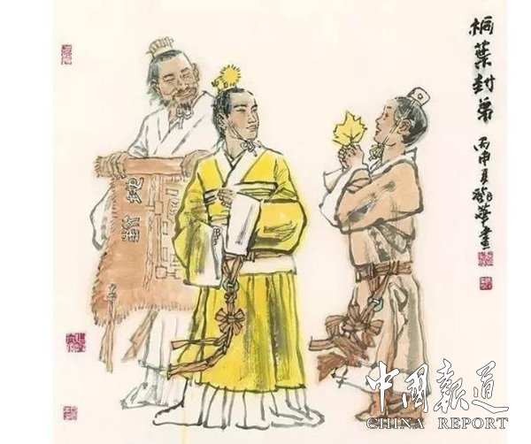當(dāng)時(shí),由于周成王還是個(gè)孩子,朝政大事暫由他的叔父周公掌管。一天,姬誦和弟弟叔虞一起在宮中玩耍,姬誦隨手在地上撿起了一片落在地上的梧桐樹葉,把葉片剪成一個(gè)上尖下方的玉珪之狀,送給了叔虞,并且對(duì)他說:“這個(gè)玉珪是我送給你的,我要封你到唐國去做諸侯”。但他們兄弟倆都很小,并不懂得天子將玉珪授給弟弟,就意味著封弟叔虞為侯是真,以為不過是鬧著玩玩而已。