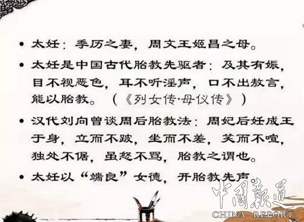 太妊在主持后宮期間,立身端莊,因為她的率先垂范,宮庭上下肅穆祥和。太妊有了身孕,懷上姬昌(即周文王)后,她眼睛不看邪事物和景象,耳不聽淫逸無禮的聲音,口不講傲慢自大的言語,不歪著身子睡覺,閑時就正心靜座,讓樂師朗誦詩歌來陶冶情操?!读遗畟?middot;母儀傳·周室三母》中記載:“大妊(太妊)者,文王之母,摯任氏中女也。王季娶為妃。大妊之性,端以成莊,惟德之行。及其有娠,目不視惡色,耳不聽淫聲,口不出敖言,能以胎教。溲于豕牢,而生文王。文王生而明圣,太妊教之,以一而識百,卒為周宗。君子謂大妊為能胎教。古者婦人妊子,寢不側(cè),坐不邊,立不蹕,不食邪味,割不正之食,席不正不坐,目不視于邪色,耳不聽于淫聲。夜則令瞽誦詩,道正事。如此,則生子形容端莊,才德必過人矣。故妊子之時,必慎所感。感于善則善,感于惡則惡。人生而肖萬物者,皆其母感于物,故形音肖子。文王母可謂知肖化矣。”這就是說,太妊在懷孕之時,以保持仁愛祥和的心態(tài),讓胎兒受到良好的教育。