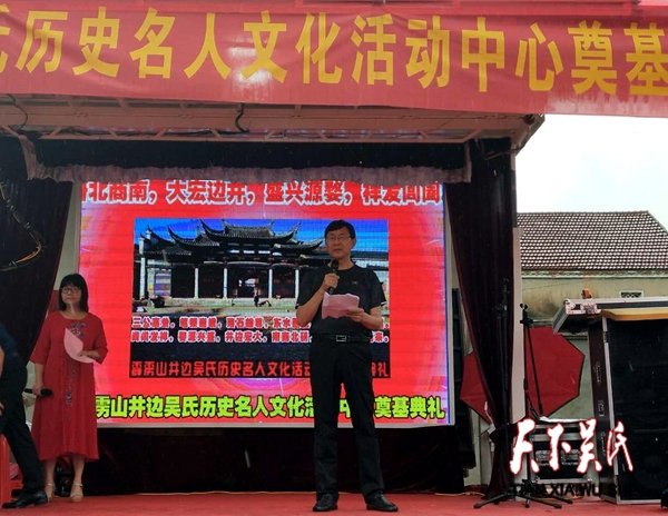 專程從省城趕來(lái)祝賀的安徽至德傳統(tǒng)文化研究院首席顧問德良先生,安徽至德文化交流中心永文常務(wù)副主任為奠基活動(dòng)送來(lái)了”千年根基永固,萬(wàn)世宗風(fēng)長(zhǎng)存”的錦旗.安徽至德傳統(tǒng)文化研究院執(zhí)行院長(zhǎng)吳瑞賢先生應(yīng)邀致辭.他在致辭中說(shuō):今天在人文薈萃,歷史悠久,民風(fēng)淳樸,百姓殷富的井邊,開展此項(xiàng)活動(dòng)意義及其深遠(yuǎn);明代杰出的小說(shuō)家西游記作者吳承恩祖籍就是這里高甸的;晚清文學(xué)家教育家京師大學(xué)堂總教習(xí)吳汝倫先生,是會(huì)宮鎮(zhèn)老橋村吳牛莊的吳汝倫;被國(guó)父孫中山褒譽(yù)為”愛有吳君,奮力一擲”愿以身殉,敢為天下先的吳樾……