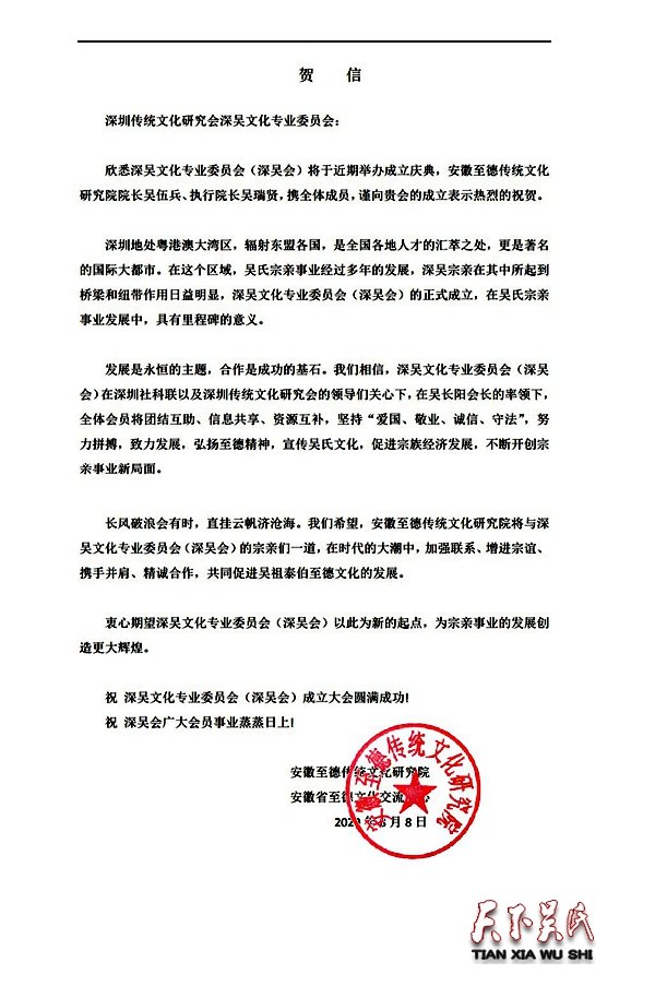 欣悉深吳文化專業(yè)委員會(深吳會)將于近期舉辦成立慶典,安徽至德傳統(tǒng)文化研究院院長吳伍兵、執(zhí)行院長吳瑞賢,攜全體成員,謹(jǐn)向貴會的成立表示熱烈的祝賀。