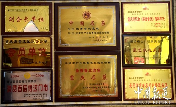 魚香春北渡魚先后獲得“中國名菜”“誠信企業(yè)”“先進商會”“江津區(qū)知名商標”“廣興創(chuàng)業(yè)致富帶頭人”“十佳富硒招牌菜”“江津區(qū)商會會長單位”“2012年度捐資助學先進單位”“消費者信得過門市”“最受消費者喜愛餐飲名店”重慶電視臺“美食重慶推薦單位”“最受歡迎菜品”重慶市綦江旅游協(xié)會“會員單位”重慶市衛(wèi)生局“食品衛(wèi)生等級A級單位”綦江區(qū)工商聯(lián)(總商會)餐飲“副會長單位”。