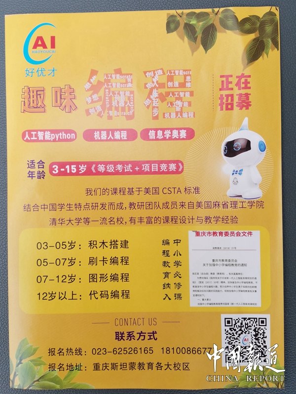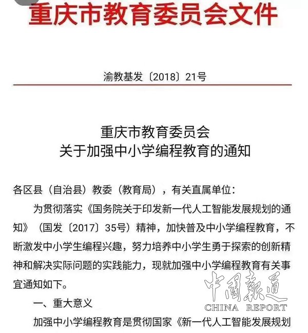 2017年教育部、2018年重慶市教委發(fā)紅頭文件明確要求:小學(xué)必修36課時(shí),初中必修36課時(shí);2019年全國(guó)校長(zhǎng)大會(huì)受邀參加研討,2020年教育部發(fā)文,明確規(guī)定從9月開(kāi)始,全國(guó)大中小學(xué)必修3門(mén)課程,分別是書(shū)法、編程、勞動(dòng)教育;機(jī)器人.少兒編程已是國(guó)家發(fā)展大趨勢(shì);