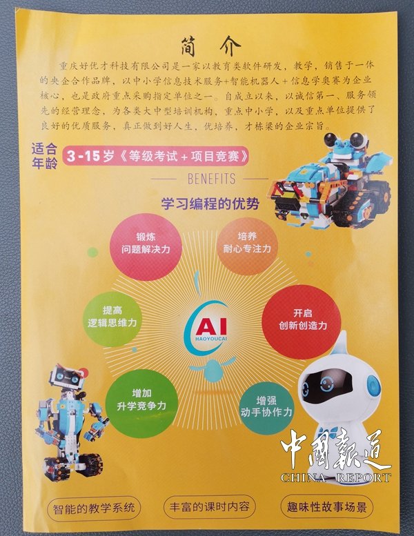 中國(guó)報(bào)道訊(吳蜀豐 報(bào)道)【編者按】未來(lái)是屬于孩子的,未來(lái)是屬于科學(xué)的,學(xué)校教育要重視培養(yǎng)學(xué)生創(chuàng)新思維和探索能力。機(jī)器人將與30年前的個(gè)人電腦一樣邁入家家戶戶,徹底改變?nèi)祟?lèi)的生活方式。重慶市政府有關(guān)政策解讀要求:明確指出小學(xué)3-6年級(jí)課時(shí)數(shù);以及初中階段課時(shí)數(shù);各中小學(xué)至少配備1名編程教育專(zhuān)職教師。重慶好優(yōu)才科技是一家以教育培訓(xùn)類(lèi)軟件研發(fā)、生產(chǎn)、教學(xué)、考級(jí)、參展、比賽和市場(chǎng)拓展于一體的央企合作品牌,以中小學(xué)信息技術(shù)+智能機(jī)器人+信息學(xué)奧賽為企業(yè)核心,政府重點(diǎn)采購(gòu)指定單位之一。公司自成立以來(lái),以誠(chéng)信第一、服務(wù)領(lǐng)先的經(jīng)營(yíng)理念,為諸多幼兒園,大中型培訓(xùn)機(jī)構(gòu),中小學(xué)以及重點(diǎn)單位提供了良好的優(yōu)質(zhì)服務(wù),真正做到好人生,優(yōu)培養(yǎng),才棟梁的企業(yè)宗旨;