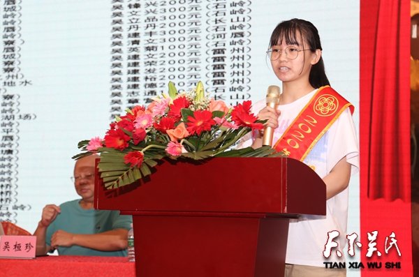 此次活動(dòng)捐資12000元助學(xué)的吳華豪表示,捐資不論多少,能夠獎(jiǎng)勵(lì)優(yōu)秀學(xué)子,將活動(dòng)舉辦成功就是最好的心愿。“我們宗族的學(xué)子通過努力學(xué)習(xí),考取了理想大學(xué),這是大家最開心的事情,獎(jiǎng)學(xué)金是對(duì)他們努力的最大肯定,也是對(duì)他們學(xué)業(yè)最大的鼓勵(lì),希望他們能夠發(fā)揚(yáng)泰伯精神,努力奮斗,早日回報(bào)家鄉(xiāng)。”考上暨南大學(xué)的吳美玲代表學(xué)子們作了發(fā)言。她表示,一定好好學(xué)習(xí),不忘父母養(yǎng)育之恩,不忘師長(zhǎng)的培養(yǎng)之情,不忘自己的家鄉(xiāng),不忘宗親們的愛心!宗親們對(duì)我們的祝愿,是愛,是鼓勵(lì),更是對(duì)我們的期望。會(huì)時(shí)刻告誡自己,一定要加倍努力學(xué)習(xí),對(duì)祖國(guó)負(fù)責(zé),對(duì)自己和家鄉(xiāng)負(fù)責(zé),決不辜負(fù)社會(huì)和宗族的期望,努力學(xué)成歸來,回報(bào)黨和國(guó)家,回報(bào)社會(huì),回報(bào)家鄉(xiāng)父老。