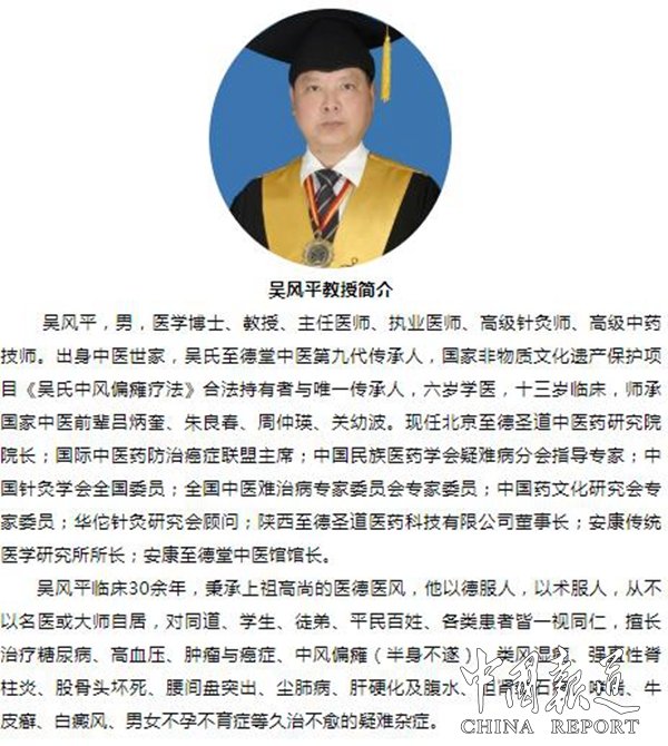吳風(fēng)平,男,醫(yī)學(xué)博士、教授、主任醫(yī)師、執(zhí)業(yè)醫(yī)師、高級針灸師、高級中藥技師。出身中醫(yī)世家,吳氏至德堂中醫(yī)第九代傳承人,國家非物質(zhì)文化遺產(chǎn)保護(hù)項(xiàng)目《吳氏中風(fēng)偏癱療法》合法持有者與唯一傳承人,六歲學(xué)醫(yī),十三歲臨床,師承國家中醫(yī)前輩呂炳奎、朱良春、周仲瑛、關(guān)幼波?,F(xiàn)任北京至德圣道中醫(yī)藥研究院院長;國際中醫(yī)藥防治癌癥聯(lián)盟主席;中國民族醫(yī)藥學(xué)會疑難病分會指導(dǎo)專家;中國針灸學(xué)會全國委員;全國中醫(yī)難治病專家委員會專家委員;中國藥文化研究會專家委員;華佗針灸研究會顧問;陜西至德圣道醫(yī)藥科技有限公司董事長;安康傳統(tǒng)醫(yī)學(xué)研究所所長;安康至德堂中醫(yī)館館長。