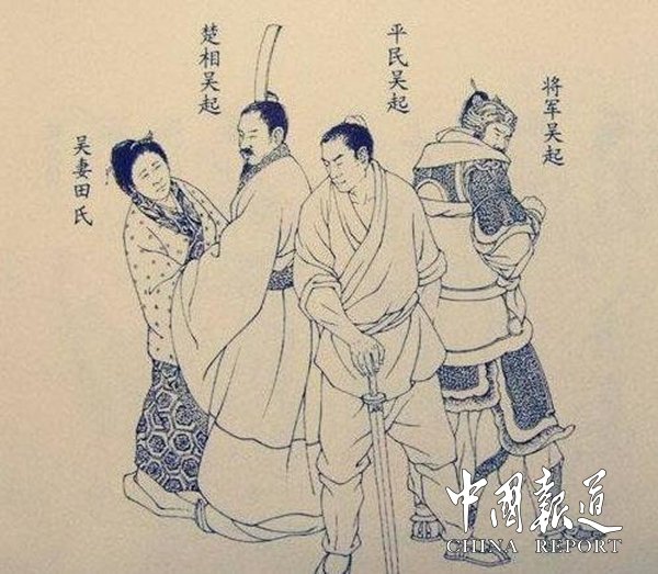 吳起讓他妻子織一條絲帶,結(jié)果長度比他要求的短了一些。吳起讓她去改一下,他妻子答應(yīng)了。等到織好了又量了量,還是不符合吳起的要求。吳起非常生氣,他妻子回答說:“我開始織的時(shí)候就把線定好了,不能再改了。”吳起于是休掉了妻子。吳起的妻子向她哥哥求助,她哥哥說:“吳起是制定法令的人,他制定法令,是想為大國建立功業(yè)。他的法令必須先要在自己的妻子身上兌現(xiàn),然后才能推行下去,你不要指望再回去了。”吳起妻子的弟弟后來被衛(wèi)國國君重用,想憑著自己的身份去求吳起與其姐復(fù)婚。吳起沒有答應(yīng),反而離開了衛(wèi)國。