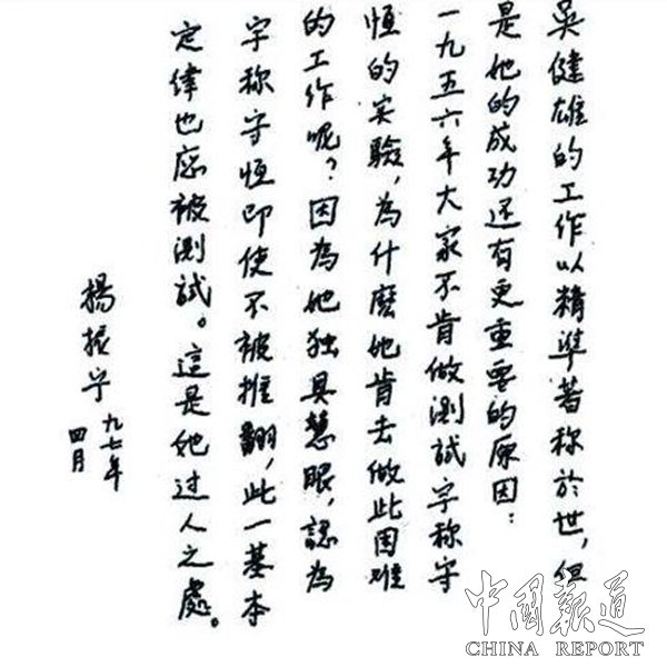 吳健雄不僅在物理學(xué)領(lǐng)域取得了許多重要發(fā)現(xiàn),她還為現(xiàn)代實(shí)驗(yàn)物理學(xué)奠定了很高的標(biāo)準(zhǔn),這個(gè)標(biāo)準(zhǔn)永遠(yuǎn)不會(huì)過(guò)時(shí)。(美國(guó)傳記作家評(píng))